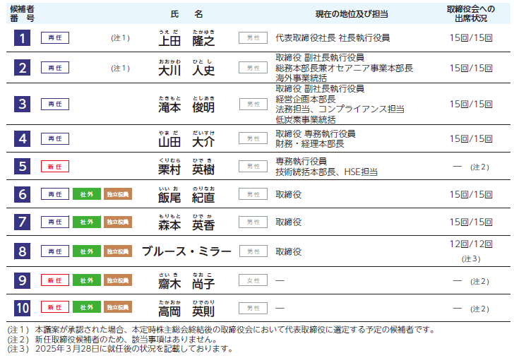 上田隆之氏は、経済産業省における経歴を通じて培われた政策並びに資源・エネルギー分野等における優れた見識・実績を有し、2017年に当社副社長執行役員に就任、2018年から業務執行の最高責任者である代表取締役社長を務めており、当社における豊富な業務経験と、エネルギー開発企業の経営全般、グローバルな事業経営及び管理・運営業務に関する知見を有していることから、引き続き取締役候補者としました。