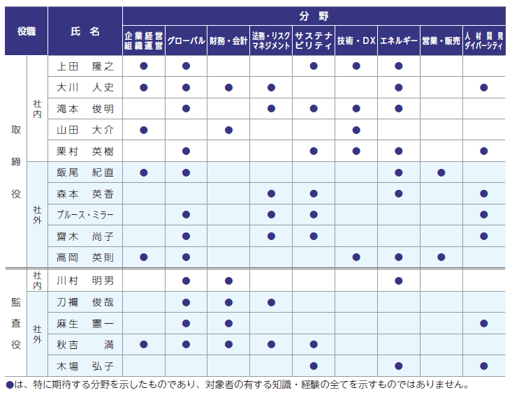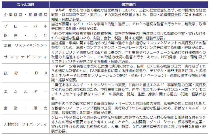 当社は、「INPEX Vision 2035『責任あるエネルギー・トランジションの実現』」を実行するため、多様かつ豊富な経験や見識を有する取締役候補者を推薦しております。