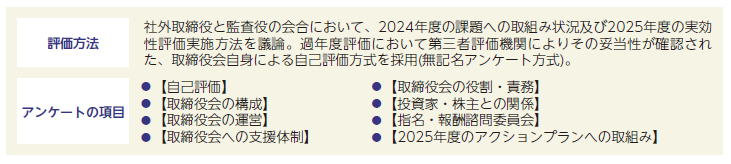 上記を含む個別の評価結果を総括した結果、2025年度の取締役会全体の実効性は、全体として2024年度に引き続き十分に確保されていると評価されました。