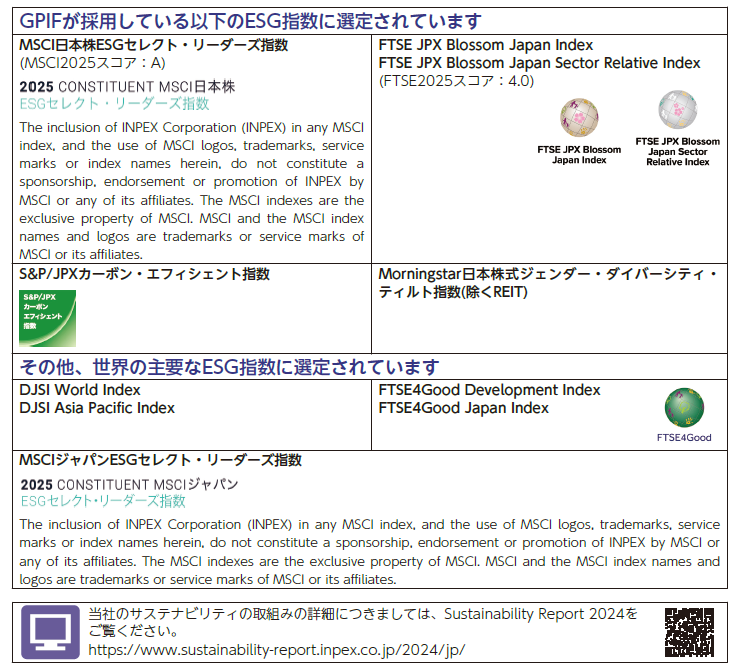 当社は、年金積立金管理運用独立行政法人(GPIF)の採用するESG指数をはじめ、世界の主要なESG指数に認定されております。