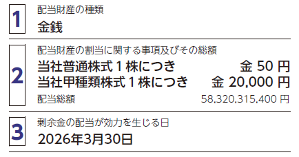 既にお支払いしている中間配当金の総額59,921,402,400円(普通株式1株につき50円、甲種類株式1株につき20,000円)を加えた年間配当金は、総額118,241,717,800円(普通株式1株につき100円、甲種類株式1株につき40,000円)となります。
