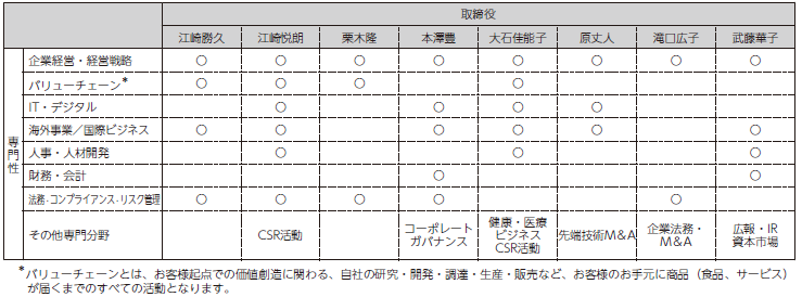当社における社外取締役候補者の選定にあたっては、これらのパーパス、ビジョン、長期経営構想及び中期経営計画の実現を通じた中長期的な企業価値の向上ならびに株主共同の利益の確保の観点から、社外取締役に求められる資質に加え、取締役会全体のスキルバランスや多様性について、過半数が独立社外取締役で構成されかつ独立社外取締役が議長を務める指名・報酬委員会において慎重な議論を行っております。当社の社外取締役に求められる資質については、専門性や経験として、企業経営・経営戦略、バリューチェーン、IT・デジタル、海外事業・国際ビジネス、人事・人材開発、財務・会計、法務・コンプライアンス・リスク管理、その他専門分野における知見を重視しております。