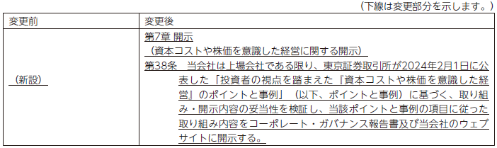 上記のとおり、当社グループは「資本コストや株価を意識した経営の実現に向けた対応」に関して鋭意取組みを推進しております。一方で、経営環境や事業戦略の変化に応じて、内容や手法を柔軟に見直していくことが不可欠であり、会社の根本規則である定款に提案の内容を規定することで、それ自体が目的となってしまい、かえって経営の機動性や実効性を損なうおそれがあると考えております。