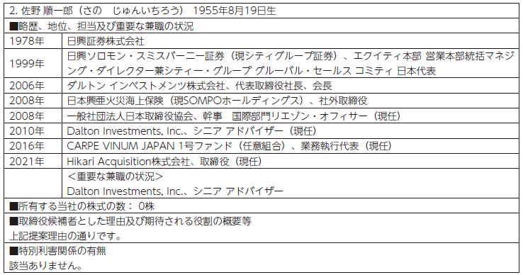 本提案株主が提案する社外取締役候補者2名はいずれも、当社の主要株主であるダルトン・インベストメンツ・インク(※発行済株式総数の10.27%を保有)の役職員です。そのため、仮に当該候補者が社外取締役に就任した場合、特定の株主の利益を代表する立場にあることから、当社の一般株主との間で利益相反が生じるおそれがあると認識しております。