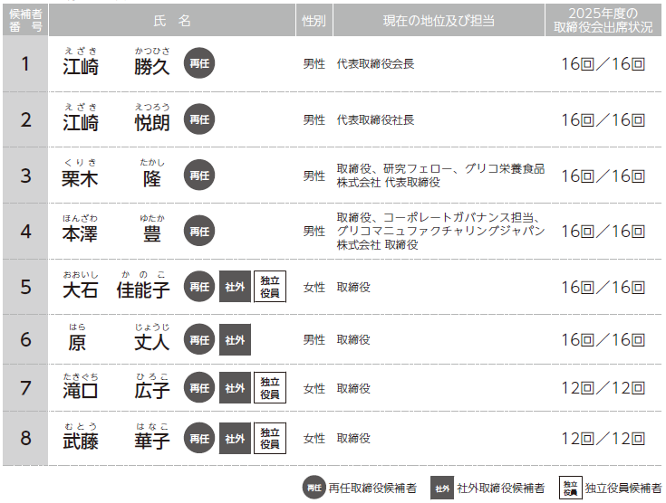 江崎勝久氏は、1982年6月に代表取締役に就任して以来、当社グループの事業拡大、グローバル化、構造改革等を推進してまいりました。また、長期計画を策定し、事業の強化・拡大に努めております。今後も、当社の経営理念を実現し事業戦略を遂行できると判断して、引き続き取締役として選任をお願いするものであります。