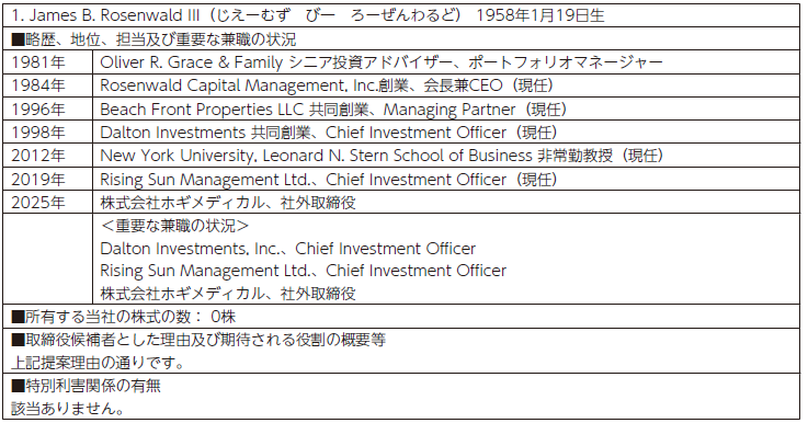 2026年1月27日付けの日経新聞においても、本提案株主の代表者であるローゼンワルド氏による当社の非公開化を目指す発言や、本株主提案候補者の一人であるローゼンワルド氏が社外取締役として就任した株式会社ホギメディカルを引き合いに出し、カーライル・グループの株式公開買い付けにより非公開化した株式会社ホギメディカルと同様に、当社に対してもPEファンドによる買収の目論みがある旨の発言、加えてPEファンドによる当社の買収を想定した際の出資形態に関する発言等が確認されております。