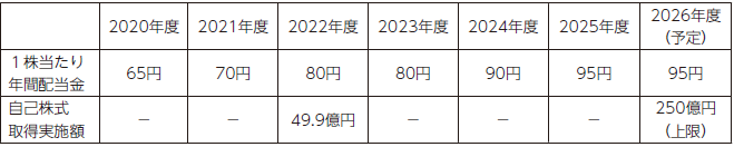 なお、これまでの株主還元実績は下表のとおりであり、2025年度については1株当たり年間配当金95円(連結配当性向120.1%)としております。