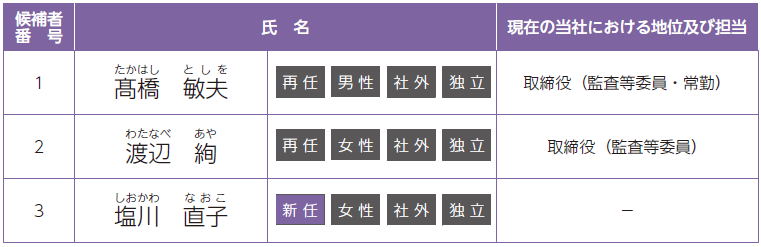 1.髙橋敏夫氏、渡辺絢氏及び塩川直子氏は、社外取締役候補者であります。