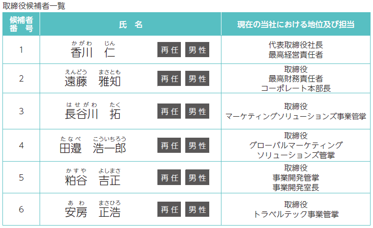安房正浩氏は、eコマース領域において、マーケティングから決済関連まで広範な分野で活躍し、インターネット業界やeコマース業界における豊富な経験と知見を有していること、また、トラベルテック分野においても豊富な経験と知見を有していることから、同氏の実務経験において培われた高い見識をもとに、当社が事業を拡大していくうえで有用な助言・提言を行い、取締役としての役割を適切に果たしております。以上のことから、同氏を引き続き取締役として、選任をお願いするものであります。