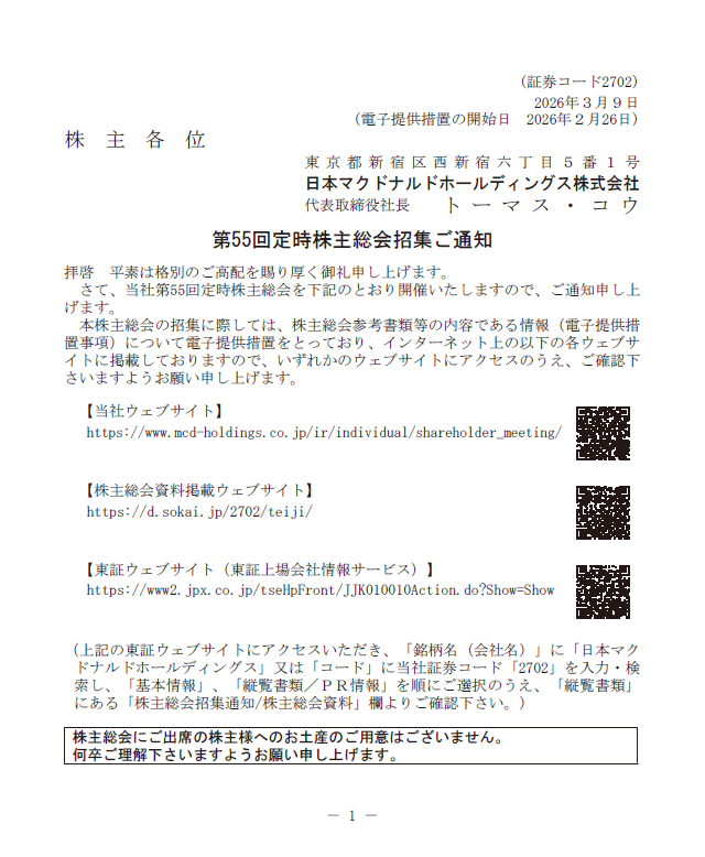 トーマス・コウ氏は、海外の複数のマクドナルド関連企業やマーケットにおいて、戦略インサイトのディレクター、CFO及びマネージングディレクター等を歴任した後、当社(2025年から)及び当社子会社 (2024年から)の代表取締役社長兼最高経営責任者(CEO)として当社グループを牽引し、豊富な実績並びにマクドナルドビジネス及び経営に関する豊富な見識を有しております。同氏のこれまでの職務における豊富な経験及び見識を踏まえ、引き続き当社の企業価値の向上に貢献できると判断し、取締役候補者といたしました。
