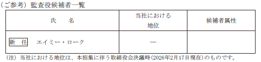 つきましては、監査役1名の選任をお願いいたしたいと存じます。なお、監査役候補者エイミー・ローク氏は、エレン・カイヤ氏の補欠として選任されるものではなく、その任期は選任後4年以内に終了する事業年度のうち最終のものに関する定時株主総会終結の時までとなります。