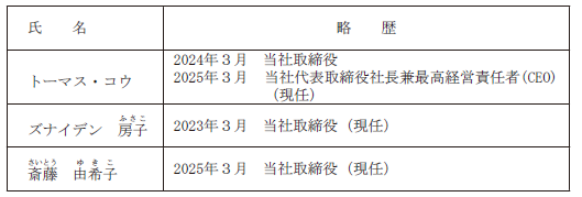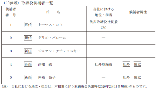 本総会終結の時をもって、取締役のトーマス・コウ氏、ヨー・センペルズ氏、上田昌孝氏及び高橋鉄氏、計4名の任期が満了となります。また、取締役アンドリュー・グレゴリー氏は、2026年2月6日をもって一身上の都合により、取締役を辞任いたしました。