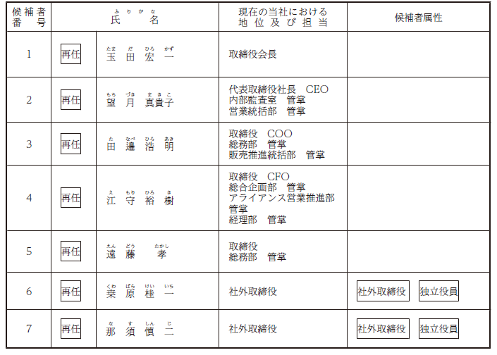 6.当社は、桒原桂一氏及び那須慎二氏を東京証券取引所の定めに基づく独立役員として届け出ております。各候補者が再任された場合は、当社は引続き各氏を独立役員とする予定であります。