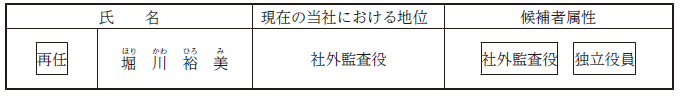 6.当社は、堀川裕美氏を東京証券取引所の定めに基づく独立役員として届け出ております。候補者が再任された場合は、当社は引続き各氏を独立役員とする予定であります。
