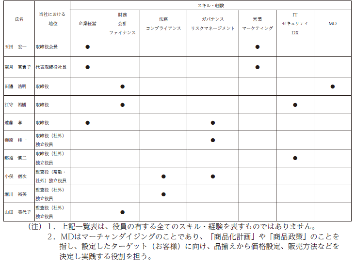 (注)本招集ご通知記載の候補者を原案どおり全てご選任いただいた場合の各役員のスキルマトリックスは以下のとおりとなります。
