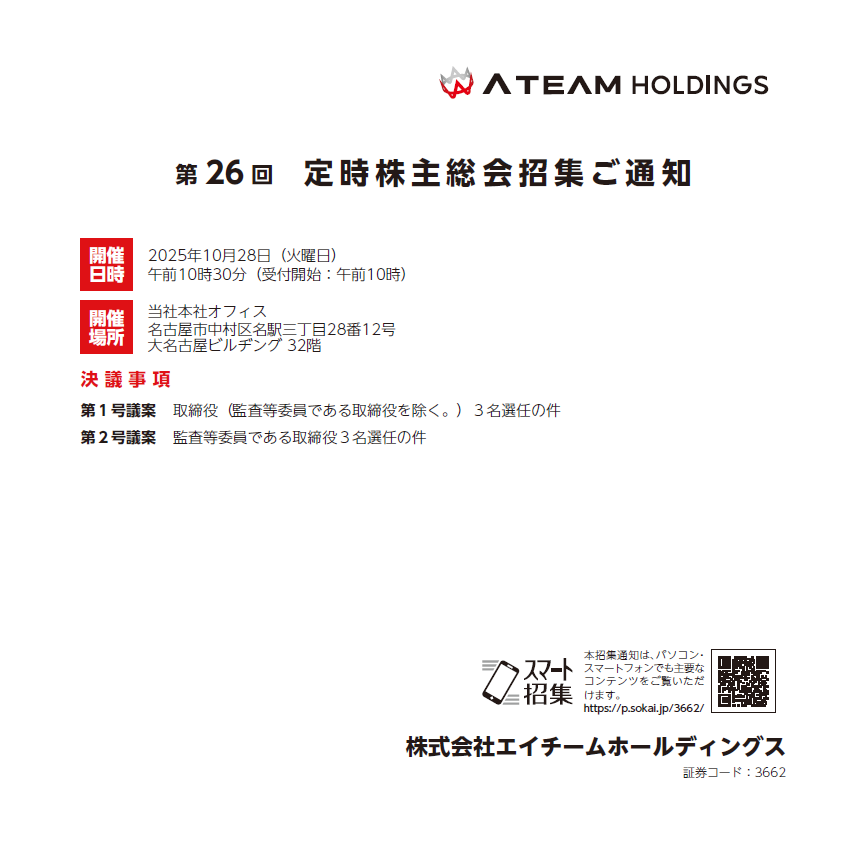 引き続き、経営理念である「みんなで幸せになれる会社にすること」「今から100年続く会社にすること」及び”Ateam Purpose”である「Creativity×Techで、世の中をもっと便利に、もっと楽しくすること」を基に、当社グループのさらなる企業成長並びに企業価値向上を目指すにあたり、同氏の求心力と優れた経営力が必要であるため、取締役候補者に定めました。候補者と当社の特別の利害関係等