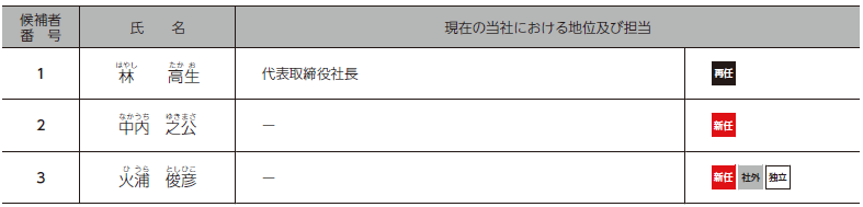 4.当社は、加藤淳也氏、北川ひろみ氏及び土井竜二氏を東京証券取引所の定めに基づく独立役員として届け出ており、各氏の選任が承認された場合は、加藤淳也氏及び北川ひろみ氏は継続して、また土井竜二氏の選任が承認された場合は新たに独立役員として指定する予定であります。