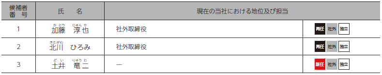 1.加藤淳也氏、北川ひろみ氏及び土井竜二氏は、社外取締役候補者であります。