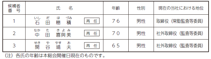 本総会終結の時をもって、監査等委員である取締役石田穂積氏、中田喜與美氏及び関谷靖夫氏が任期満了となります。つきましては、監査等委員である取締役3名の選任をお願いいたしたいと存じます。