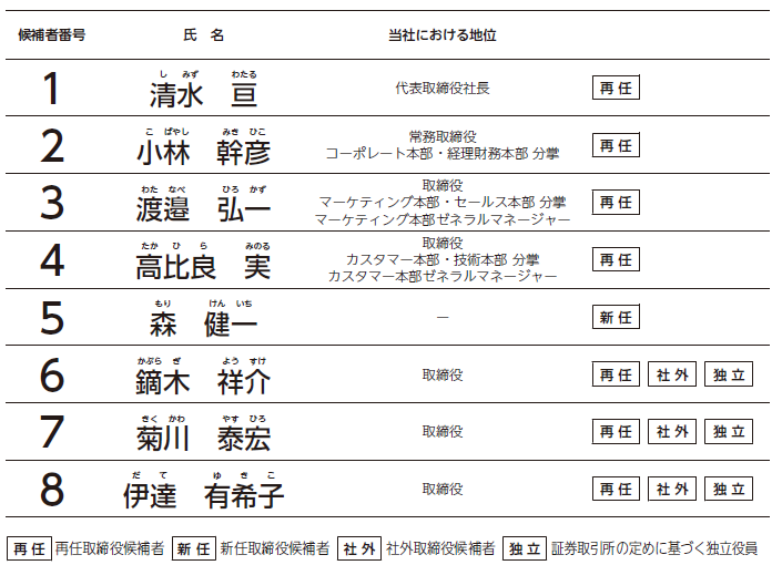 清水 亘氏は、2008年3月から代表取締役社長としての職責を担っており、その能力及び豊富な業務経験を、今後も当社の経営に活かしていただくため、取締役として選任をお願いするものであります。
