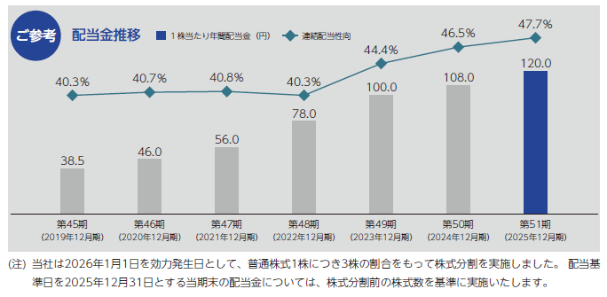 すでに実施済みの中間配当金1株につき58円とあわせまして、年間配当金は前期比12円増額の1株につき120円、連結配当性向は47.7%(※)となります。