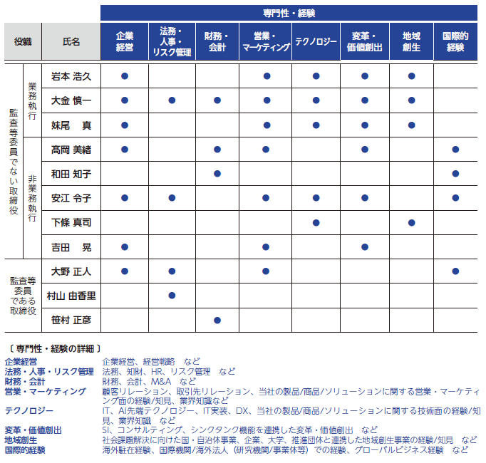 (1)経営、法律、財務・会計、情報技術、コーポレートガバナンス、リスク管理等の分野における豊富な経験または専門的な知識を有すること