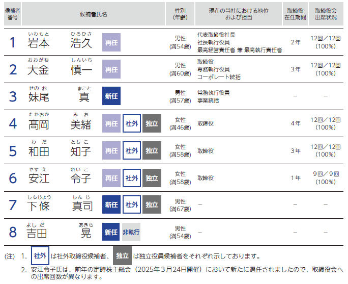 (注) 「社外 」は社外取締役候補者を示しております。