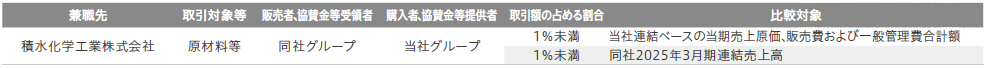 候補者と当社との特別の利害関係等 畑中好彦氏は、積水化学工業株式会社の社外取締役を兼職しており、当社と兼職先とは以下の関係があります。