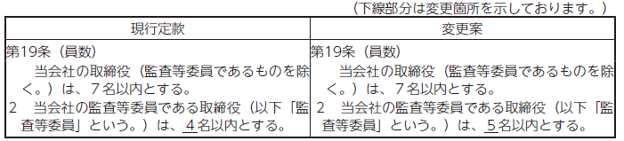 監査等委員である社外取締役増員による監督機能の強化及びコーポレートガバナンスの強化のため、現行定款第19条(員数)に定める監査等委員である取締役の員数を、4名以内から5名以内に変更するものであります。
