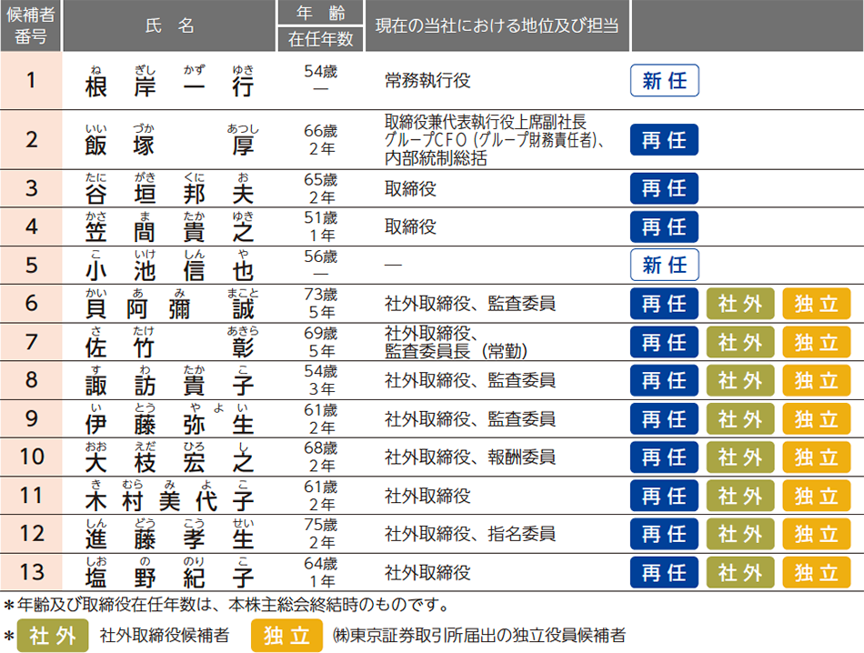 取締役全員(15名)は、本株主総会終結の時をもって任期満了となります。つきましては、指名委員会の決定に基づき、社外取締役が過半を占める構成は維持しつつ、経営体制の効率化のため2名を減員し、取締役13名の選任をお願いいたしたいと存じます。