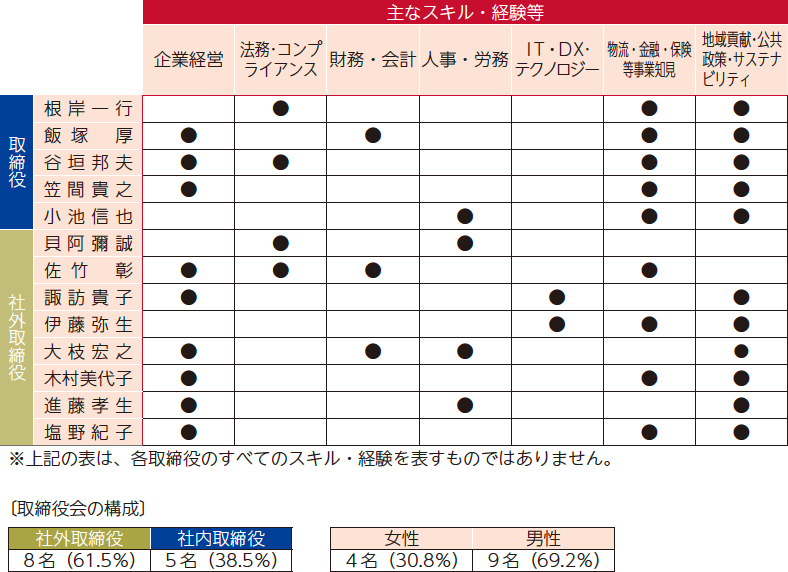 当社常務執行役日本郵便㈱常務執行役員東海支社長2025年4月当社常務執行役(現任)〔地位及び担当〕常務執行役重要な兼職の状況 日本郵便㈱取締役、㈱ゆうちょ銀行取締役、㈱かんぽ生命保険取締役(いずれも2025年6月就任予定)取締役候補者とした理由 根岸一行氏は、主要子会社である㈱かんぽ生命保険の営業部門、資金運用部門及び日本郵便㈱の経営企画部門、コンプライアンス部門など幅広い分野での職務経験を有しております。