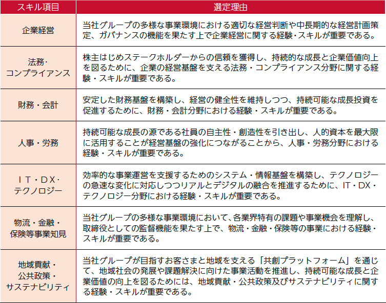 議案のとおり取締役を選任いただいた場合の各取締役が有する主なスキル・経験等の分野は以下のとおりです。