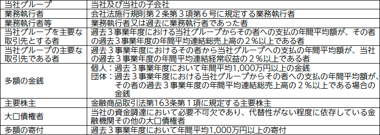 - 当社グループから多額の寄付を受けている者(当該寄付を受けている者が法人、組合等の団体である場合は、当該団体の業務執行者等又はそれに相当する者)