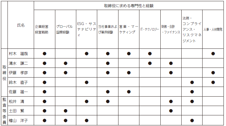 なお、当社の経営ビジョンおよび中期経営計画「GREENS SUSTAINABLE JOURNEY 2028」の実現に向け、当社の取締役および監査等委員が備えるべきスキルを「スキルマトリックス」として定義しております。