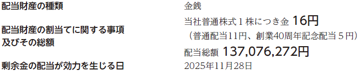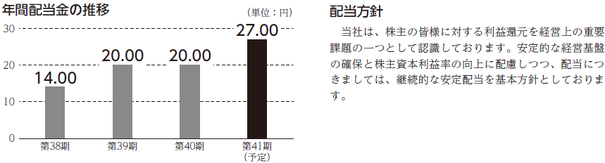 第41期の期末配当につきましては、当事業年度の業績並びに今後の事業展開等を勘案いたしまして、当期の期末配当は、普通配当11円に創業40周年記念配当5円を加え、1株当たり16円といたしたいと存じます。