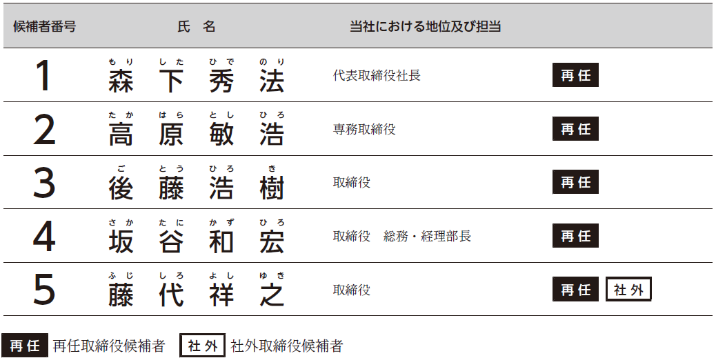 同氏は、当社代表取締役社長として、当社グループ全体の経営の指揮を執り、強いリーダーシップを発揮し、経営全般の適切な監督と意思決定ができることから、取締役としての職務を適切に遂行することができるものと判断し、取締役候補者としたものであります。
