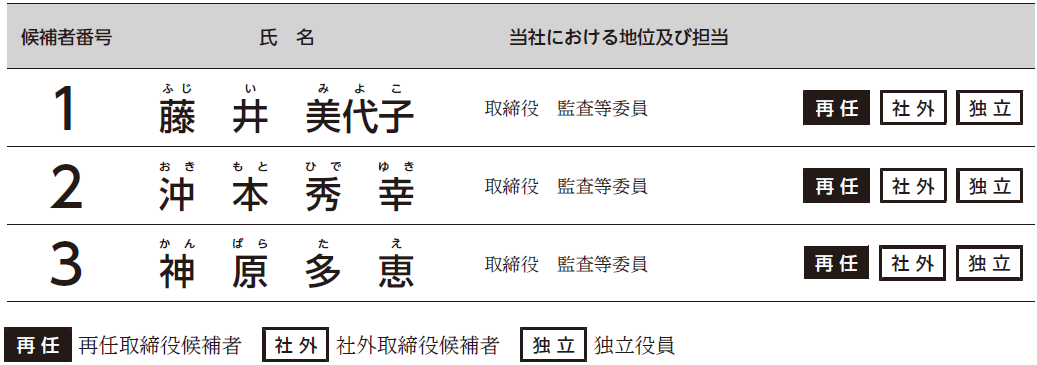 2. 藤井美代子氏、沖本秀幸氏及び神原多恵氏は、現在、当社の監査等委員である社外取締役でありますが、監査等委員である社外取締役としての在任期間は、本総会終結の時をもって藤井美代子氏が2年、沖本秀幸氏が4年、神原多恵氏が3年となります。なお、沖本秀幸氏は、過去に当社の業務執行者であったことがあります。