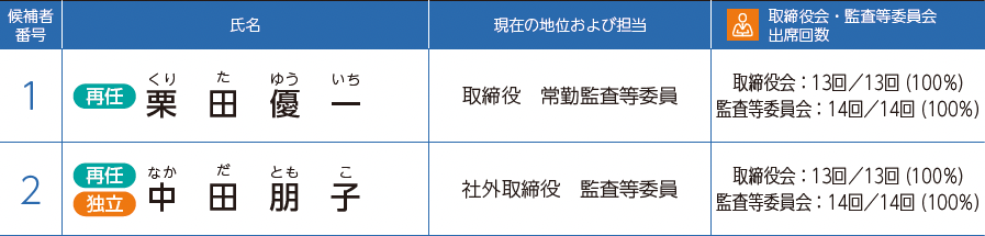 現任の監査等委員である取締役栗田優一氏および中田朋子氏は、本株主総会終結の時をもって任期満了となりますので、監査等委員である取締役2名の選任をお願いするものであります。なお、本議案につきましては、監査等委員会の同意を得ております。