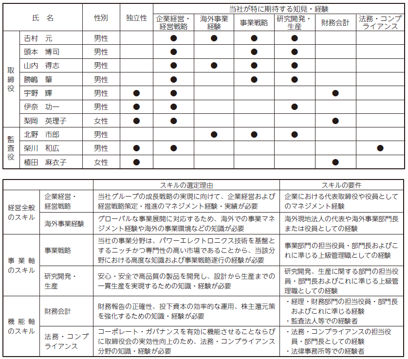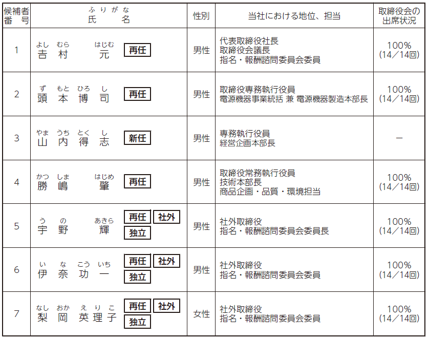 𠮷村元氏は、国内大手電機メーカーにおいて経営者として培った豊富な経験と幅広い知見を有しております。さらには、同グループにおいて海外現地法人副社長も経験し、グローバル経営への知見も豊富であります。また、当社代表取締役社長就任以降、「Global Power Solution Partner」をビジョンに掲げ、企業価値の向上に向けて成長戦略および経営改革を推進しております。今後の当社グループの持続的成長とさらなる発展を確実なものにするために、同氏のリーダーシップのもと、経営にあたることが妥当であると判断し、引き続き取締役候補者といたしました。