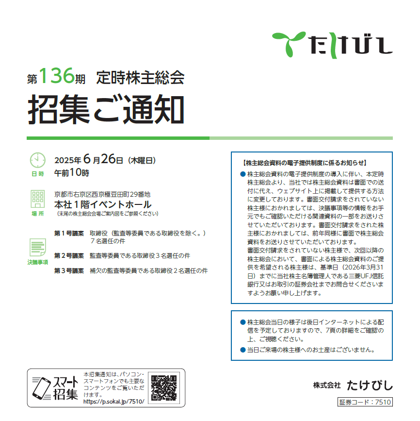 取締役(監査等委員である取締役を除く。)7名全員は、本総会終結の時をもって任期満了となります。
