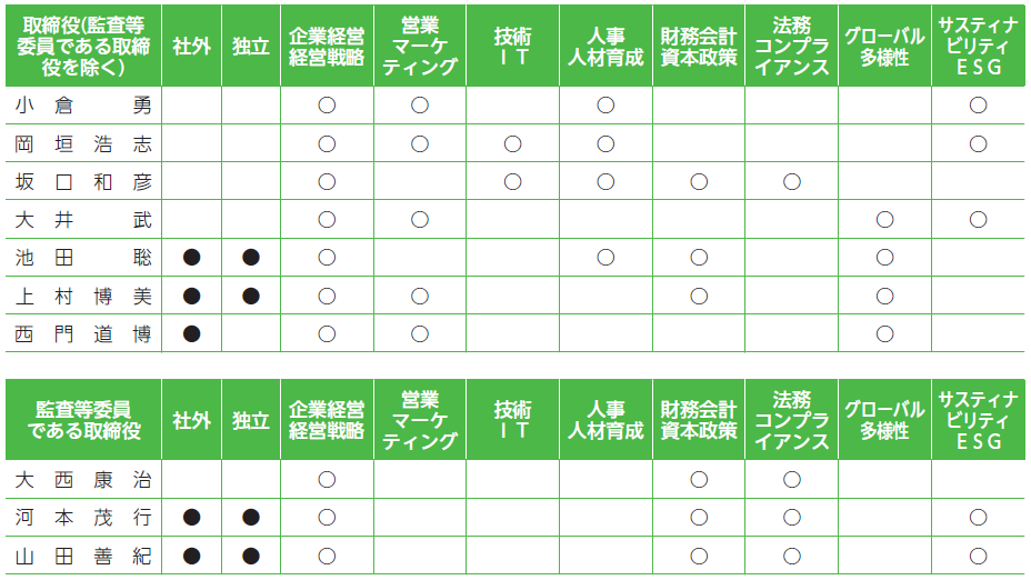 第1号議案「取締役(監査等委員である取締役を除く。)7名選任の件」及び第2号議案「監査等委員である取締役3名選任の件」が承認可決された場合、各取締役が保有している各スキルは以下のとおりとなります。