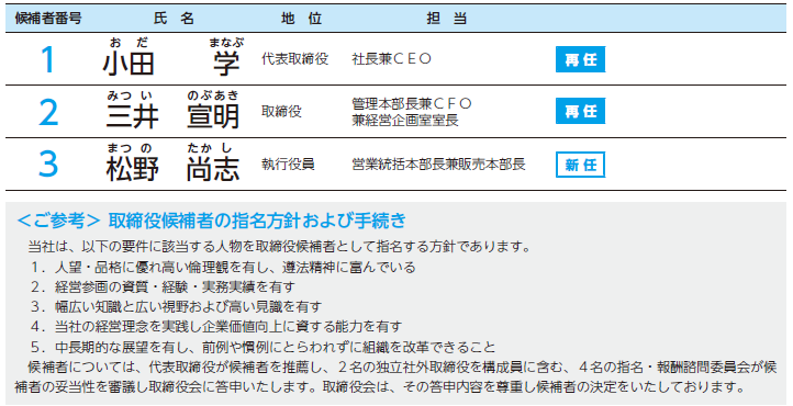 取締役(監査等委員である取締役を除きます。以下、本議案において同じです。)全員(4名)は、本総会終結の時をもって任期満了となります。つきましては、取締役会において戦略的かつ機動的に意思決定が行えるよう1名減員し、取締役3名の選任をお願いするものであります。なお、本議案の候補者については、当社の監査等委員会より特段の意見が無いことを聴取して、指名・報酬諮問委員会での審議を経て決定しております。