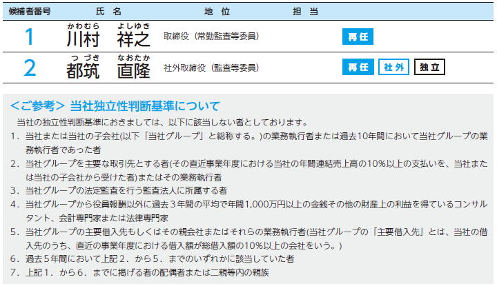 6. 当社は、本議案が承認された場合、引き続き都筑直隆氏を東京証券取引所および名古屋証券取引所の定めに基づく独立役員(社外取締役)といたします。