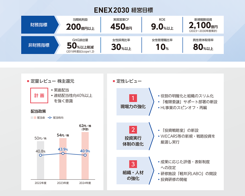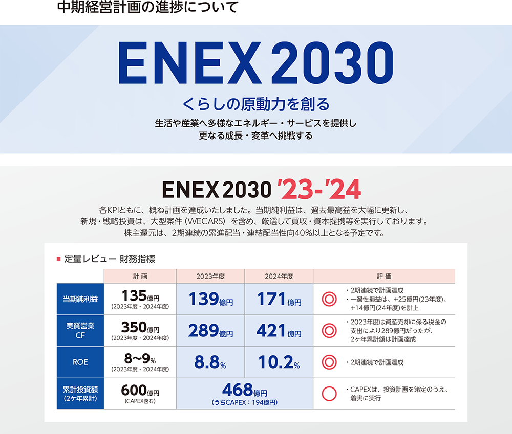 当社グループは、中期経営計画「ENEX2030 ’23-’24」で掲げる「1.現場力の強化」、「2.投資実行体制の進化」、「3.組織・人材の強化」を中心に取り組んでまいりました。