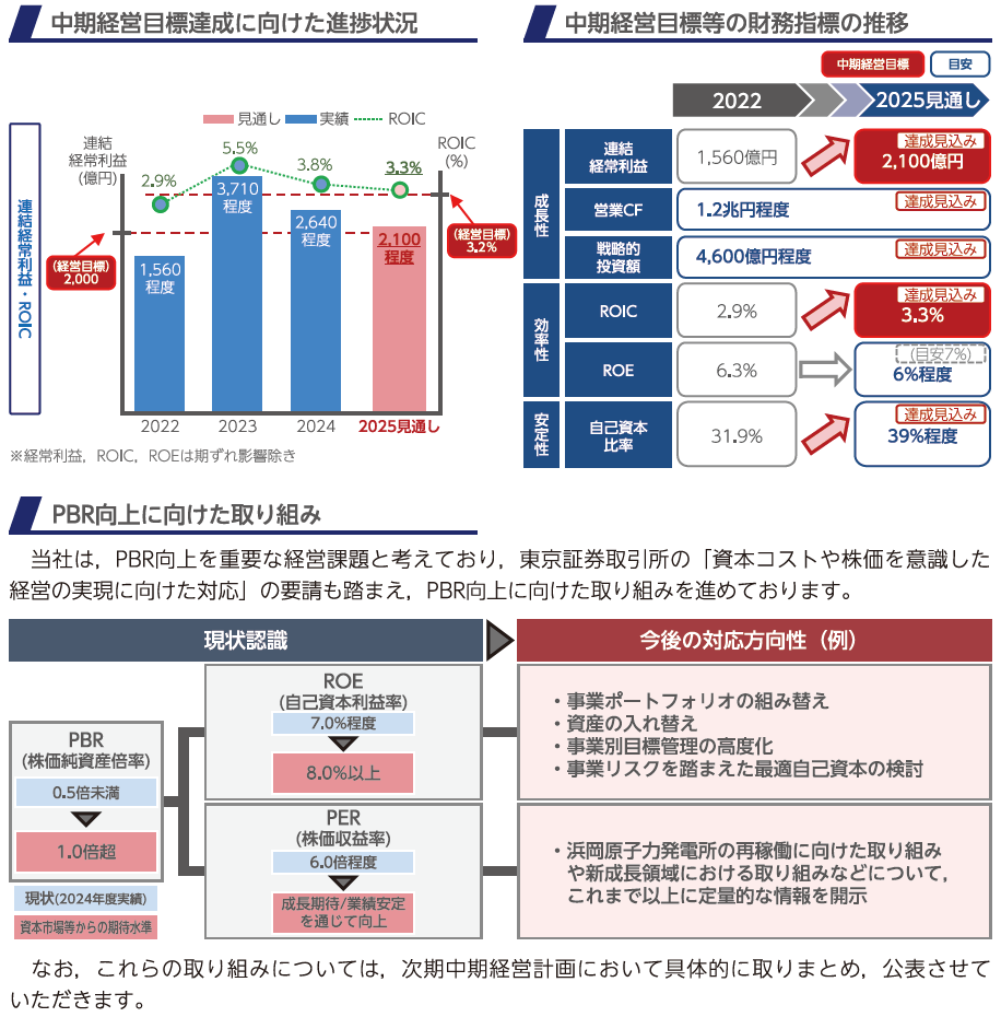 中部電力グループは,経営ビジョン2.0において,2030年度連結経常利益の2,500億円以上への拡大とバランスの取れた事業ポートフォリオの構築を掲げており,利益成長を積極的に追求することを目指しております。2025年度は,その実現に向けて策定した中期経営計画の最終年度であり,引き続き,国内エネルギー事業において安定的な利益の確保に取り組むとともに,新成長領域やグローバル事業において収益の拡大などに努め,「連結経常利益2,000億円以上,ROIC3.2%以上」の達成を目指してまいります。