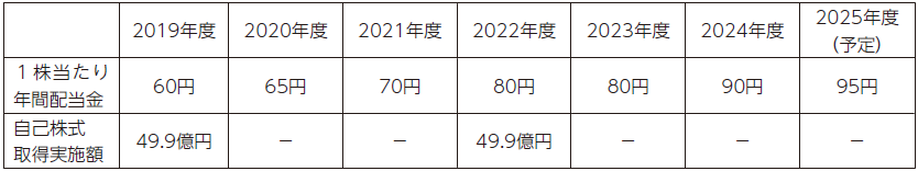 当社グループは、上記方針に基づき、中長期的な経営戦略や経営環境を踏まえ、年間配当金を決定し、安定的な配当を含めた株主還元の強化を図っております。なお、これまでの株主還元実績は下表のとおりであり、2024年度については1株当たり年間配当金90円(連結配当性向70%)としております。