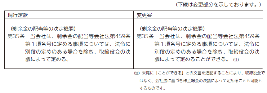 当社は、「成長投資」「事業運営資金」「株主還元」にバランスよく資金配分を行い、中長期的な企業価値の向上及び株主共同の利益の実現のため、「株主還元」について株主からの提案がある場合には株主総会の決議によっ て定めることができるよう、現行定款第35条(剰余金の配当等の決定機関)につきまして変更するものでありま す。