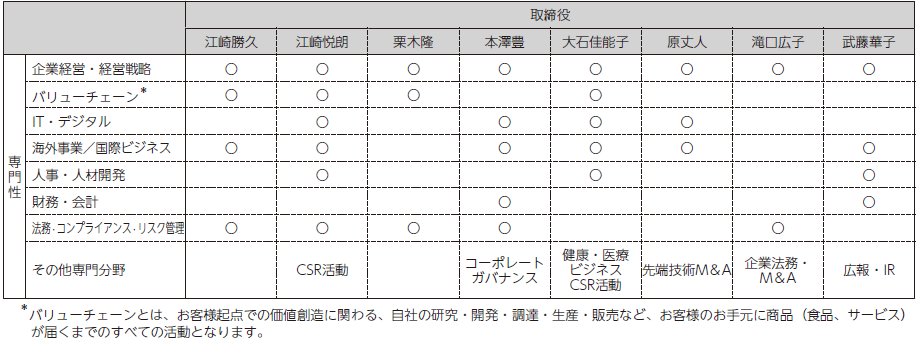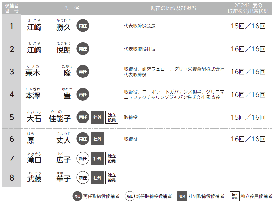 江崎勝久氏は、1982年6月に代表取締役に就任して以来、当社グループの事業拡大、グローバル化、構造改革等を推進してまいりました。また、長期計画を策定し、事業の強化・拡大に努めております。今後も、当社の経営理念を実現し事業戦略を遂行できると判断して、引き続き取締役として選任をお願いするものであります。