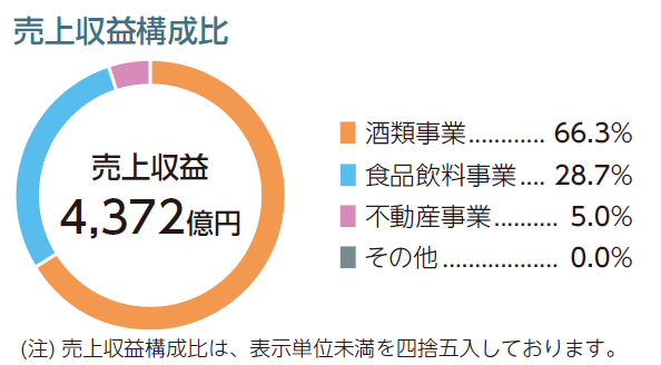 以上の結果、酒類事業の売上収益は2,897億円(前期比43億円、1.5%増)となり、事業利益は54億円(前期比31億円、129.7%増)、営業利益は21億円(前期は49億円の損失)となりました。