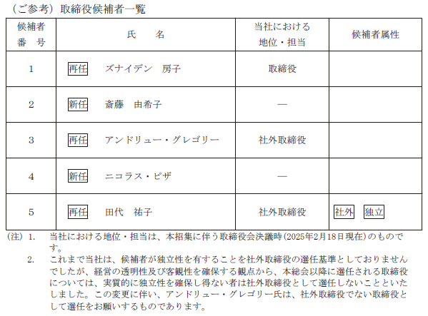 本総会終結の時をもって、取締役の日色保氏、ズナイデン房子氏、アンドリュー・グレゴリー氏、川村明氏及び田代祐子氏、計5名の任期が満了となります。
